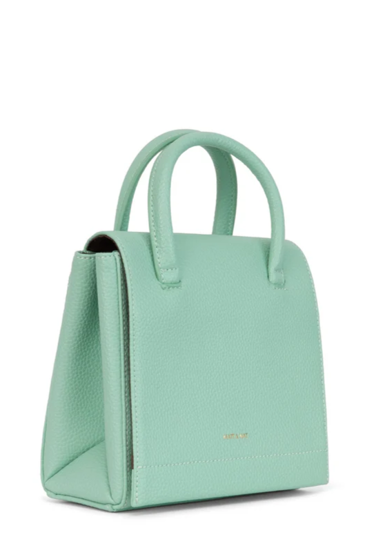 Small satchel with double handles and flap closure. Comes with a detachable and adjustable crossbody strap.