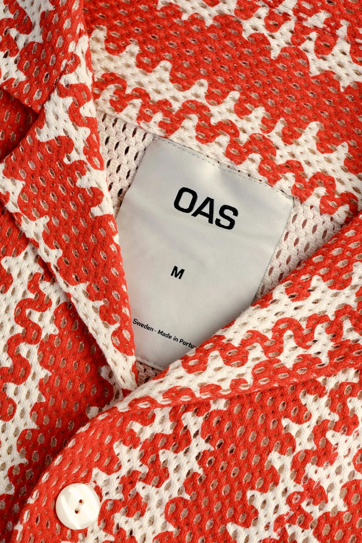 The Red Scribble Cuba Net Shirt is distinguished by a midweight bobbinet weave decorated with rhythmic waves reminiscent of sandy shores. Designed with a resort collar and buttons running down the front.