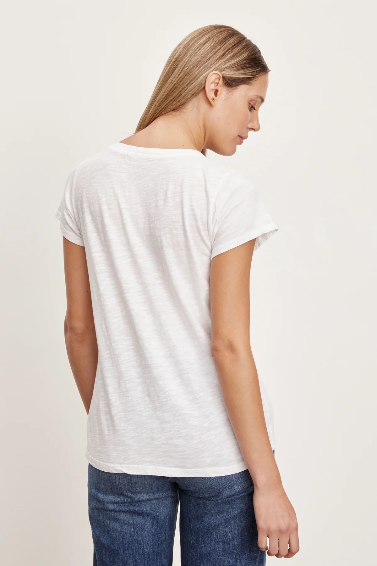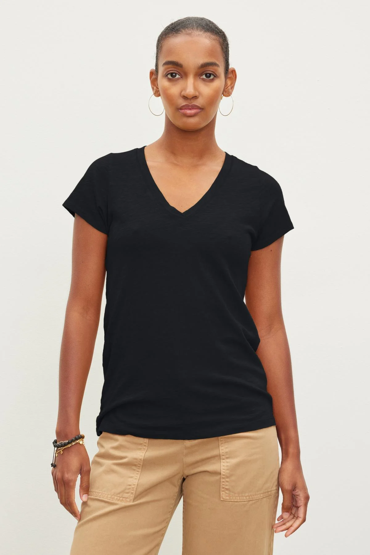 Ce tee-shirt est fabriqué à partir du tissu slub en coton signature de Velvet, offrant juste la bonne quantité de texture et garantissant un ajustement confortable et décontracté. L'encolure en V offre une apparence intemporelle, en faisant un incontournable de la garde-robe.