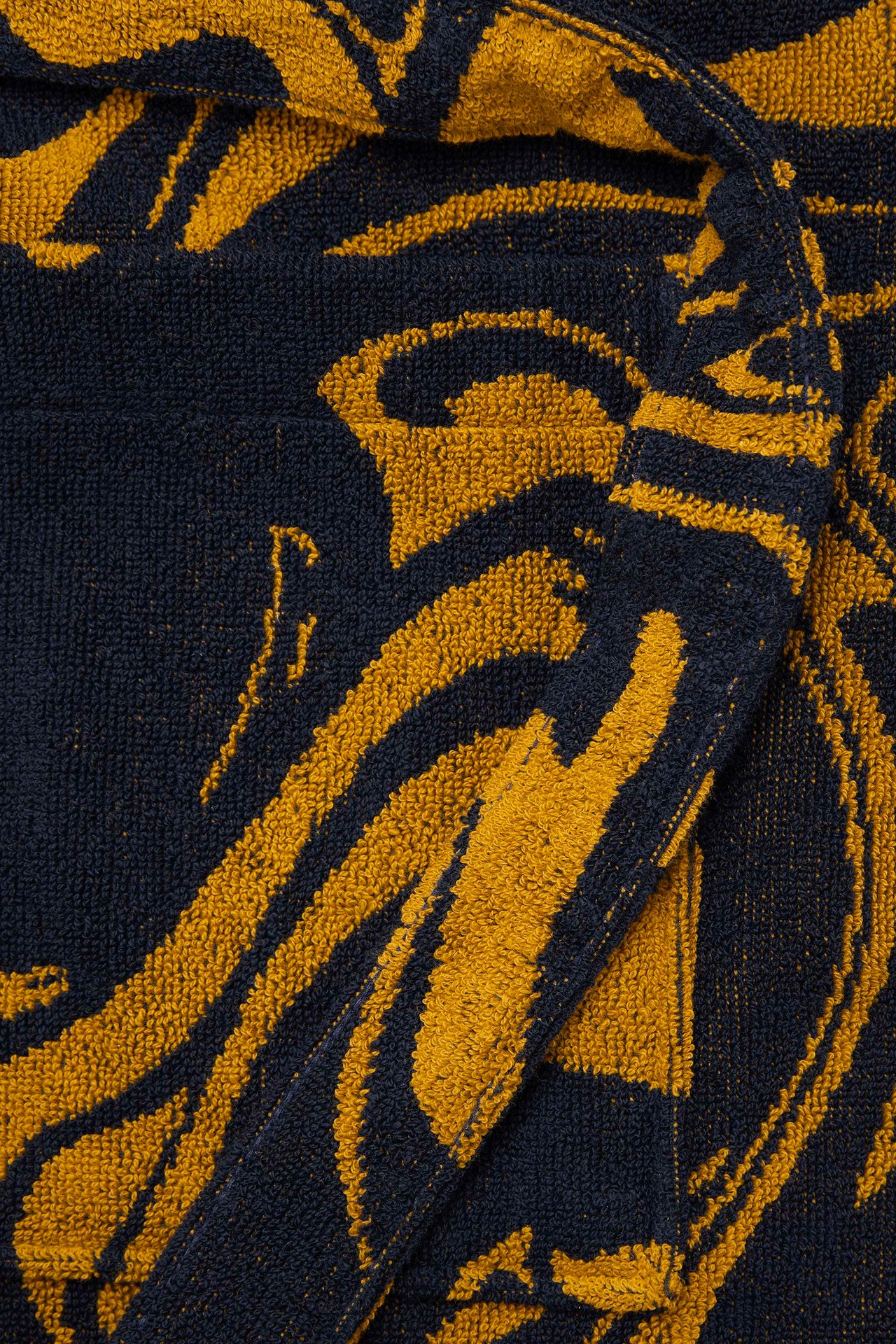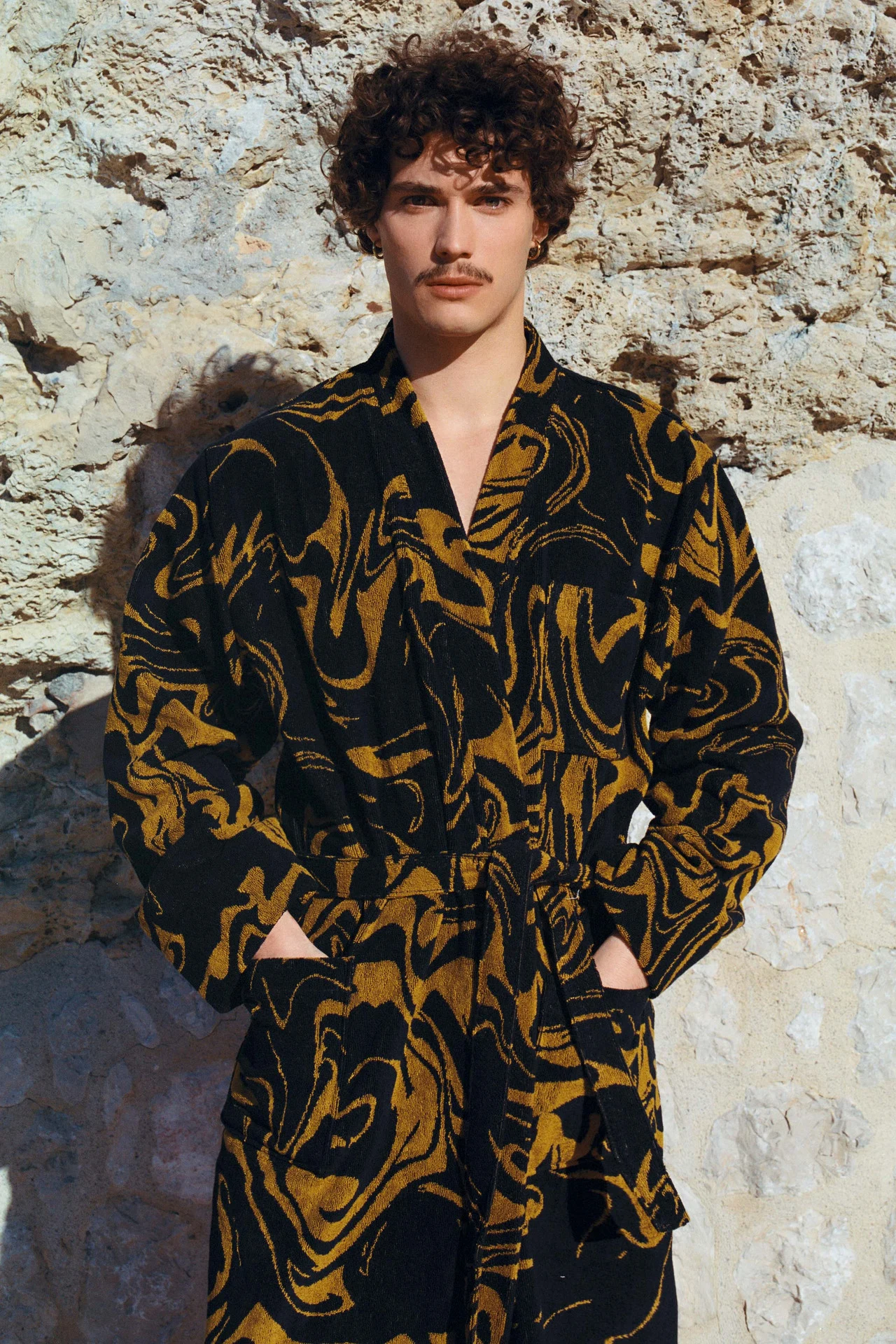 Le peignoir en marbre est tissé en jacquard à partir de coton éponge doux et absorbant, avec un motif ressemblant à des tourbillons de fumée dans une douce brise. Conçu pour envelopper le corps avec sa silhouette généreuse. Doté d'un col de style kimono, de poches plaquées et d'une ceinture amovible à nouer soi-même. Unisexe.