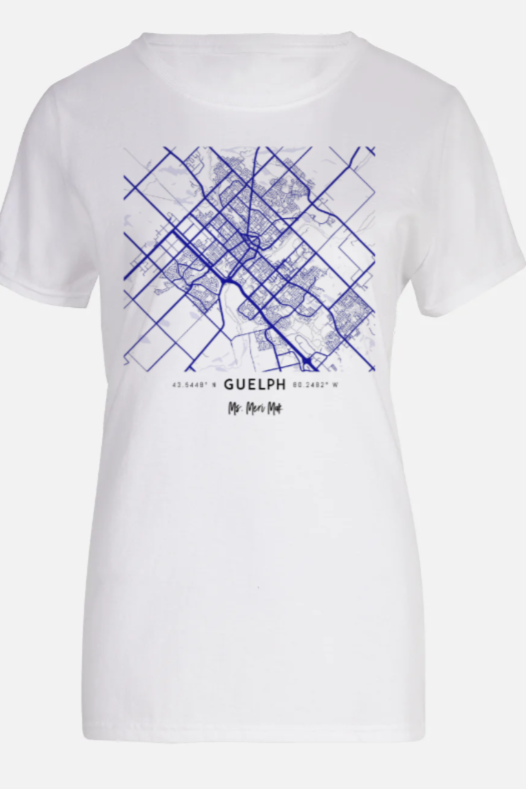 Ce tee-shirt présente une carte en grille de la ville natale de Mme Meri Mak, Guelph. Fabriqué en coton doux.