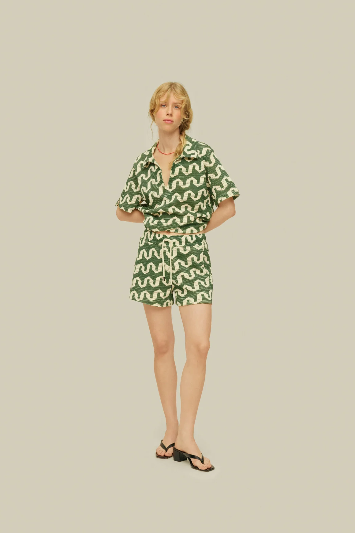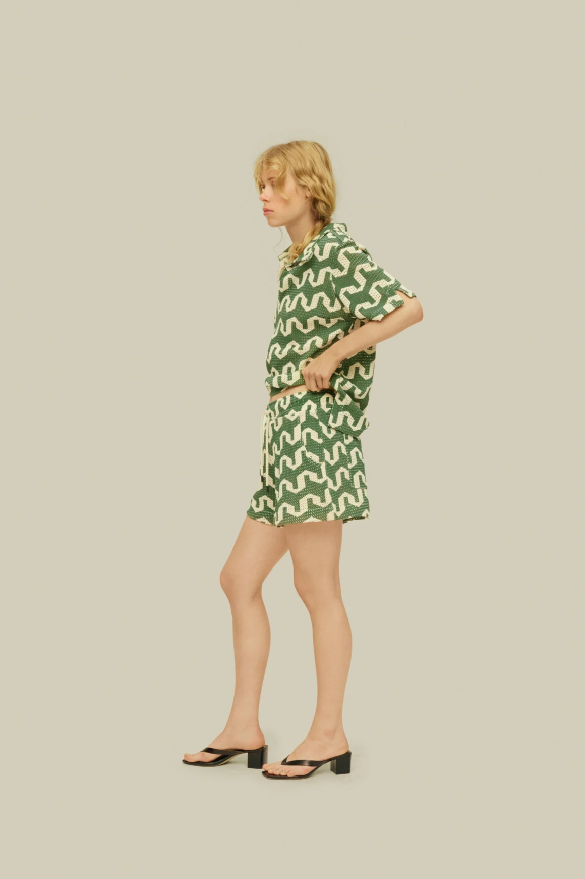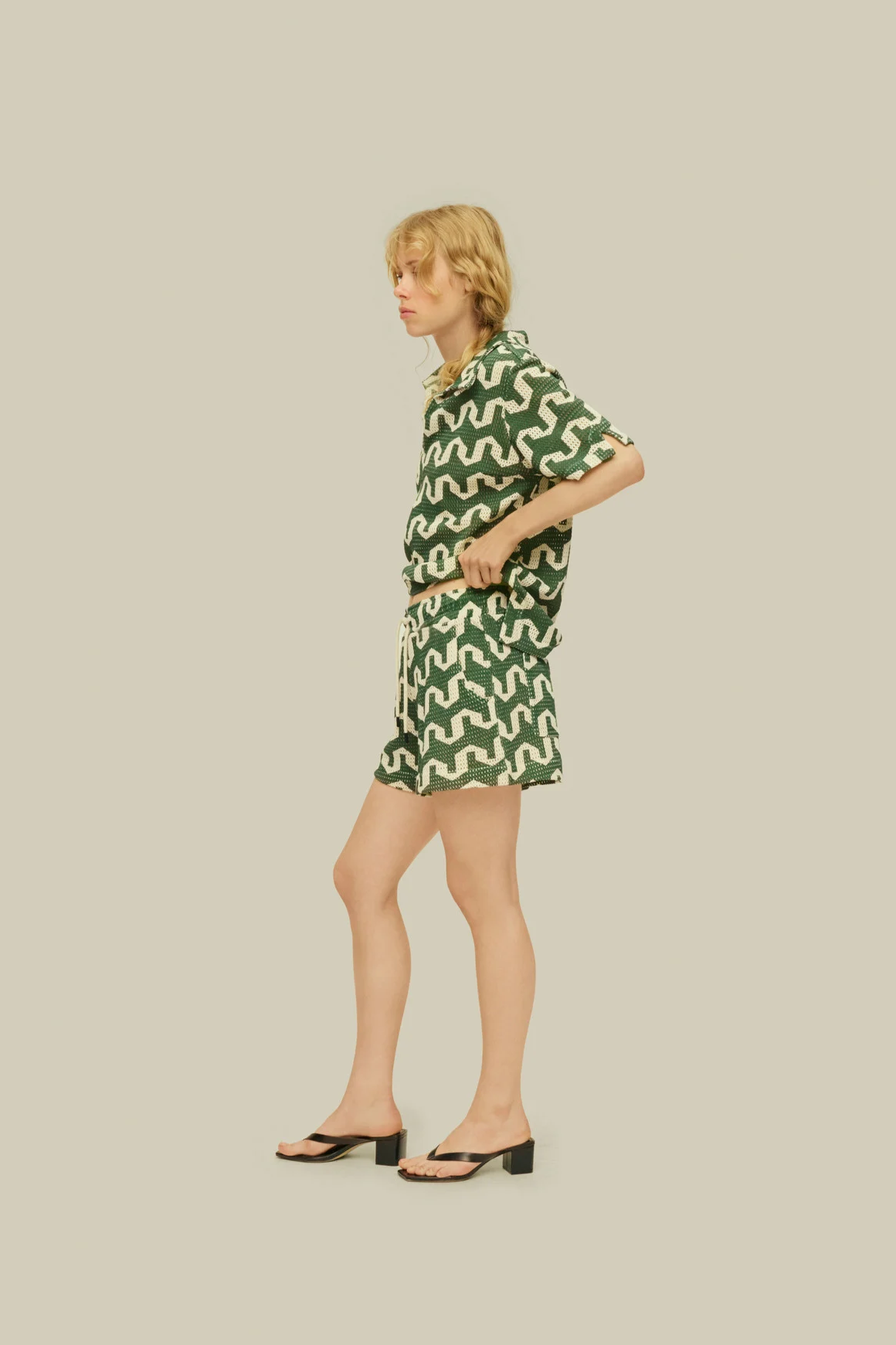 The Atlas Jaffa Net Shirt is tailored from an airy cotton bobbinet weave to an oversize silhouette with elbow-length sleeves and a deep open collar. Decorated with geometric waves, matching the coordinating net shorts.