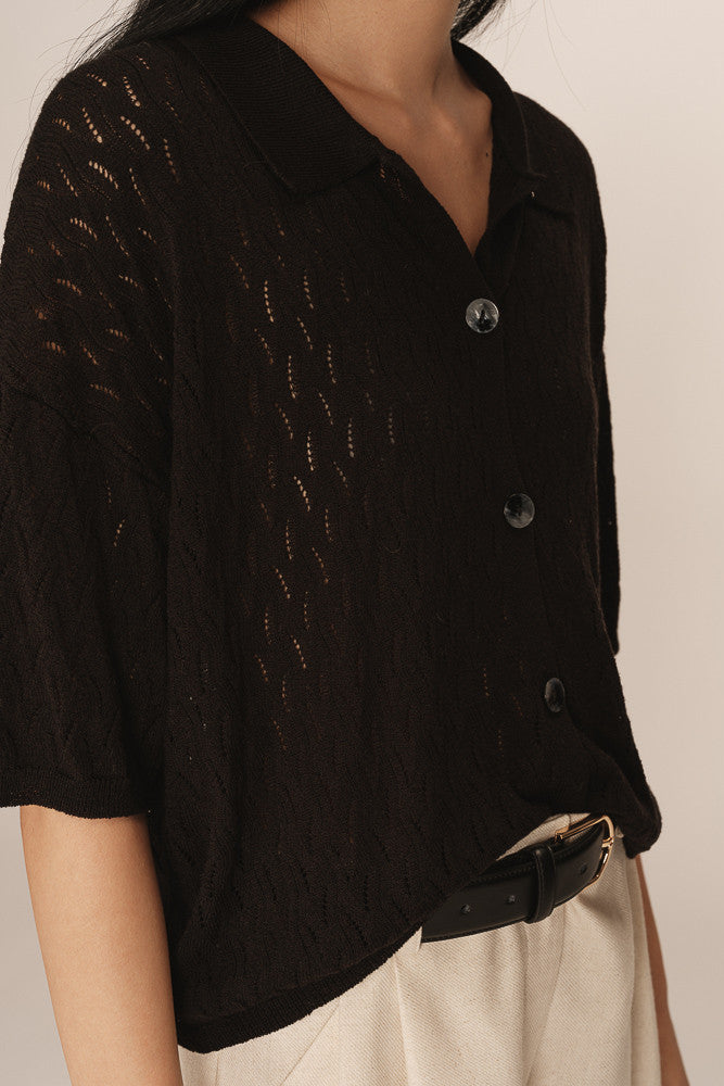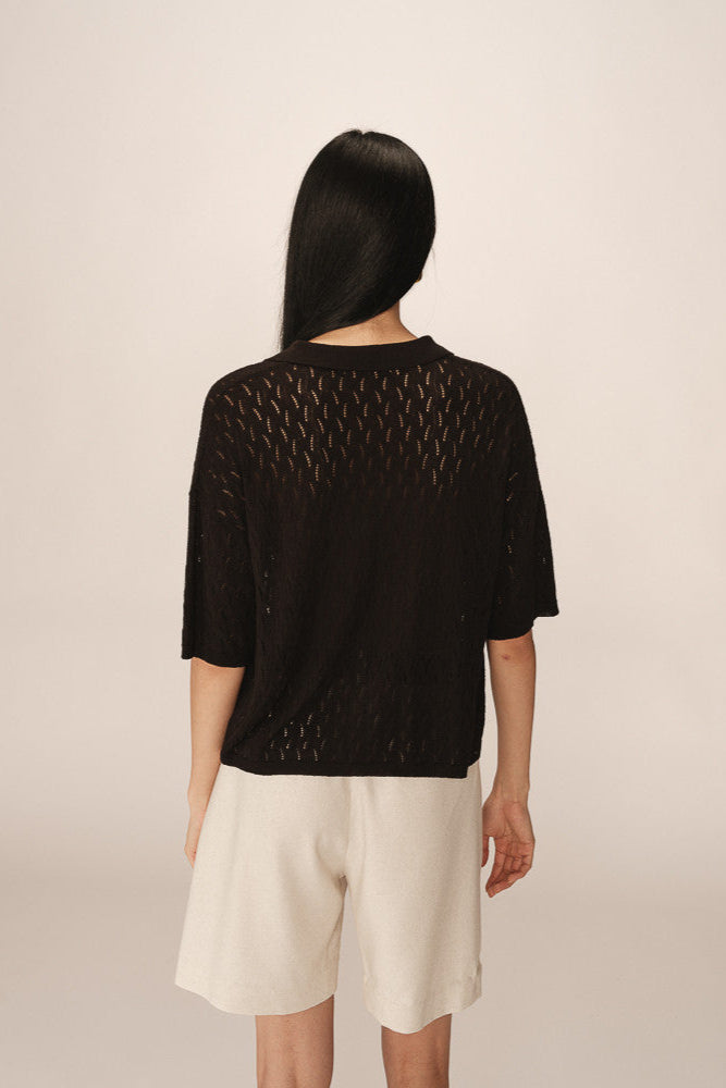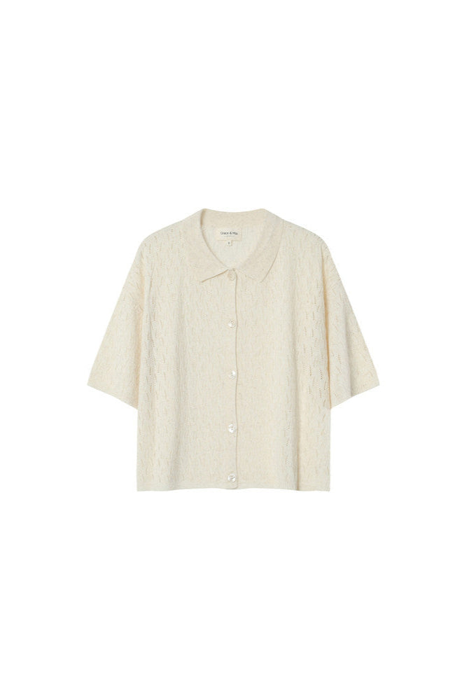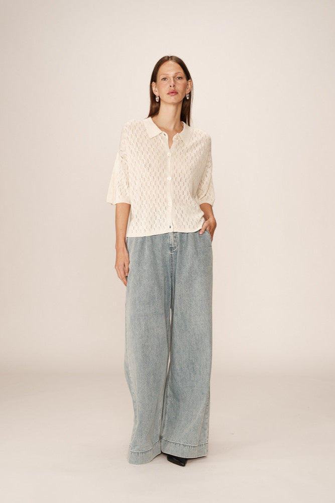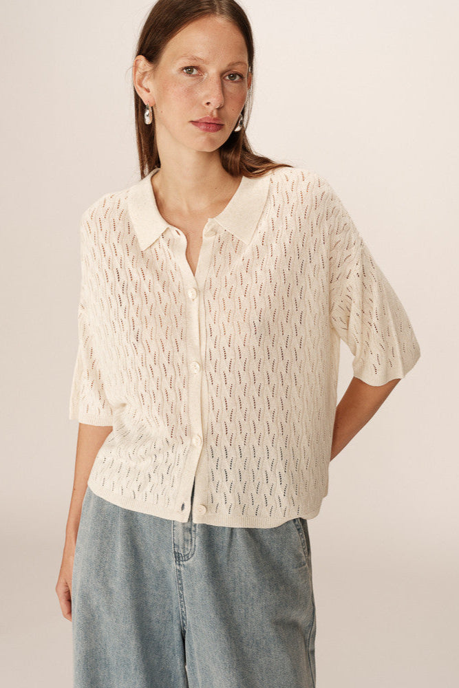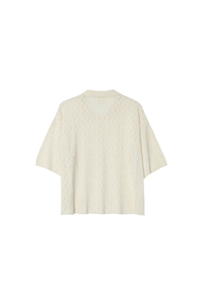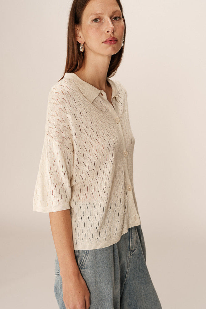 Light weight and airy, with lots of texture. Knit in a pretty pointelle stitch that shows a peek of skin and designed with a shirt collar fit that pairs perfectly with everything in your closet. Pro tip: Wear it with the Tailorless denim Jeans for an outfit that stands out.
