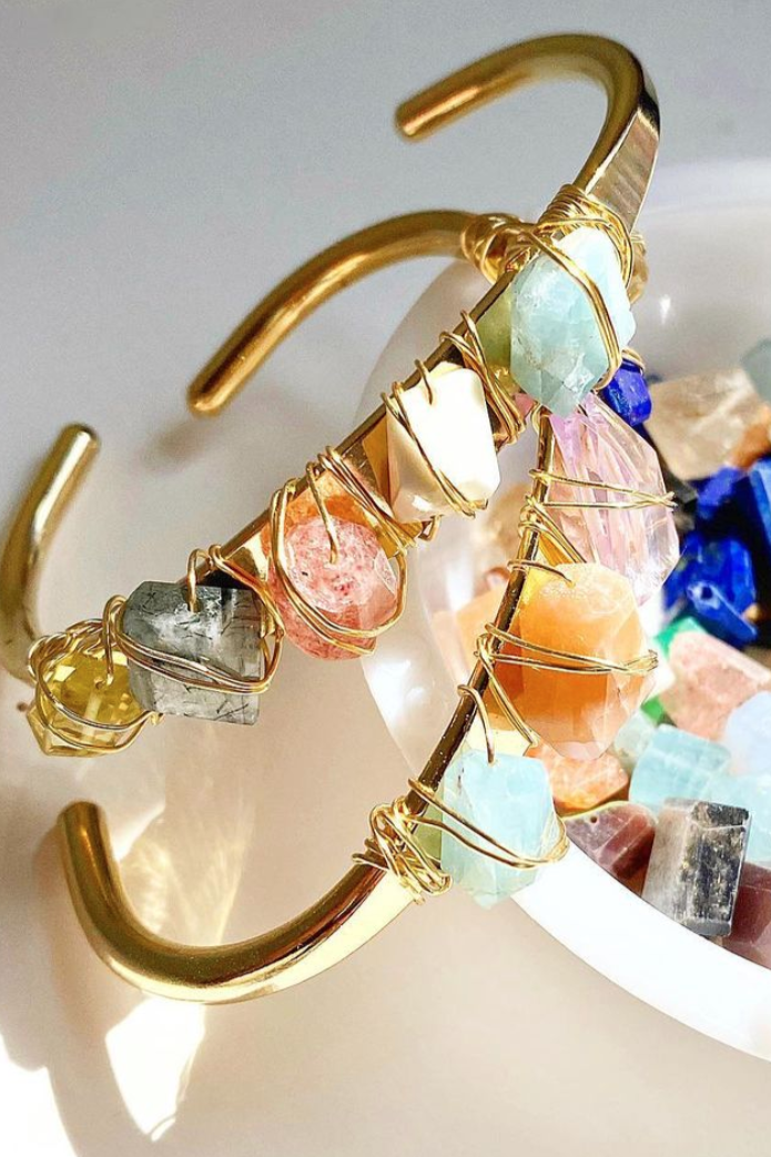 Handmade in Brooklyn, NYC. A luminous mix of rainbow gem stones captivates and sparkles in the Alignment Cuff. Each bracelet is one of a kind with its individual crystal mix, but each arrangement is made based on the positive stone properties imparted on the wearer. 5 3/4 inches best fit on small to average size wrists. Each case set comes with 1 specially crafted bracelet similar to the pieces pictured.