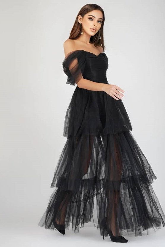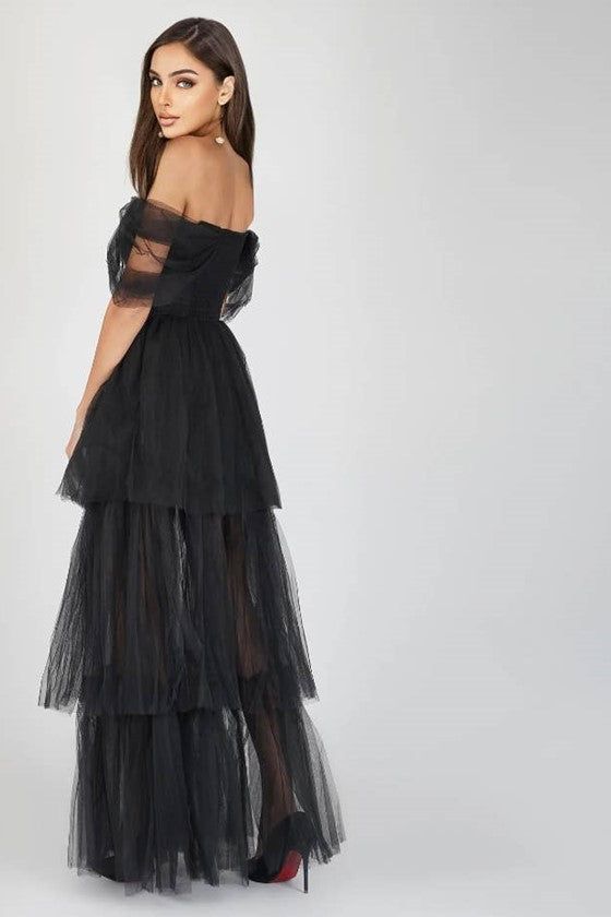 The ruched bodice and thigh high split of this tulle maxi dress make it equally romantic and elegant—and the ra-ra tiered skirt adds volume that moves with you as you make your way to the dancefloor.
