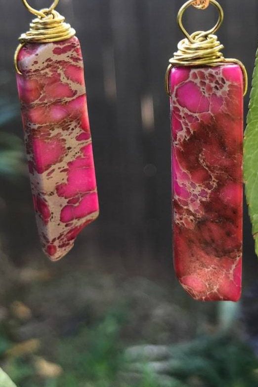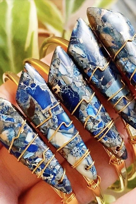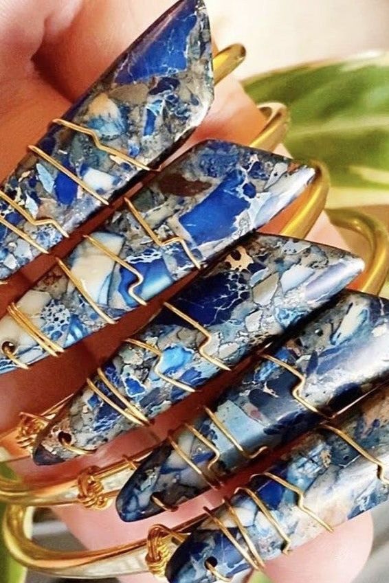 Jewelry handmade in NYC. A navy picture jasper crystal slab is securely attached with wire to the cuff base in this gem stone cuff bangle bracelet. Jasper is a crystal known to absorb negativity and protect whoever wears it. Cuffs best fit average wrists, adjustable, measures. 5 1/4 inches