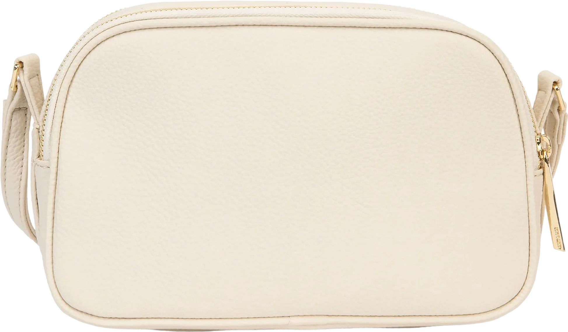 - Crossbody bag with an adjustable strap and two zippered compartments.