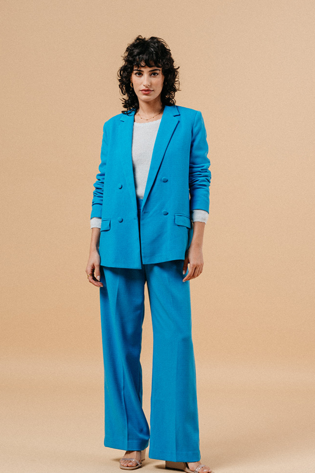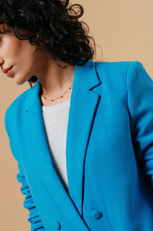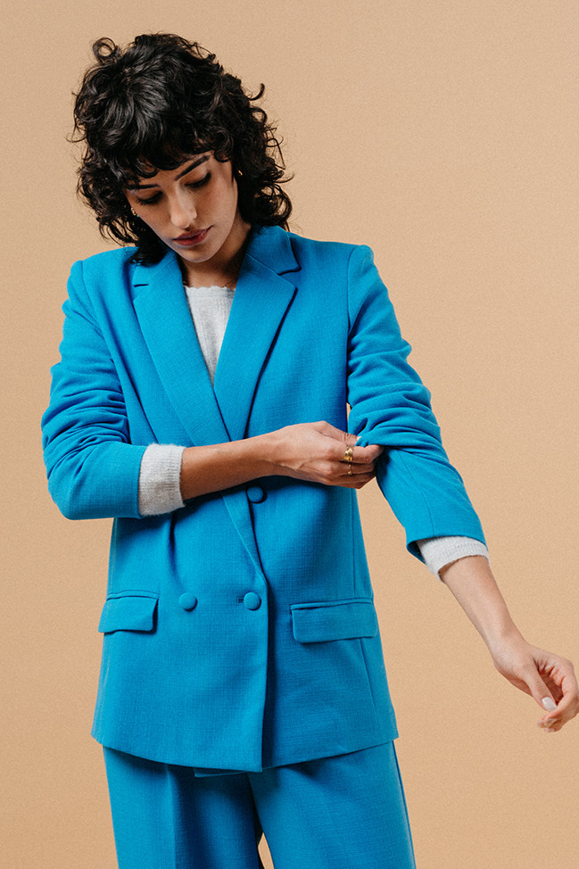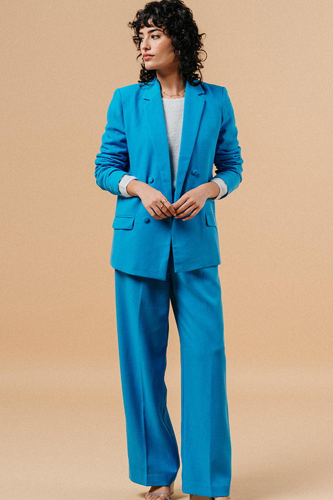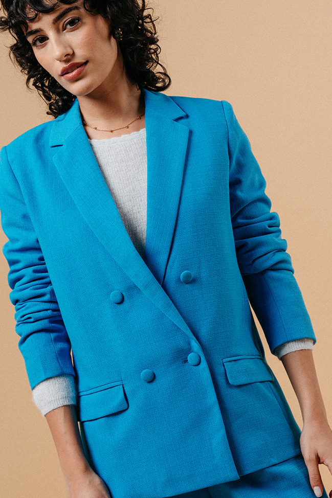 A new blazer that is relaxed yet elevated. This style mixes the classic appeal of a double-breasted silhouette with the modern flair of a subtly oversized, menswear-inspired fit. Pro tip: Pair it with the matching Marly trouser for a sleek two-piece suit look.