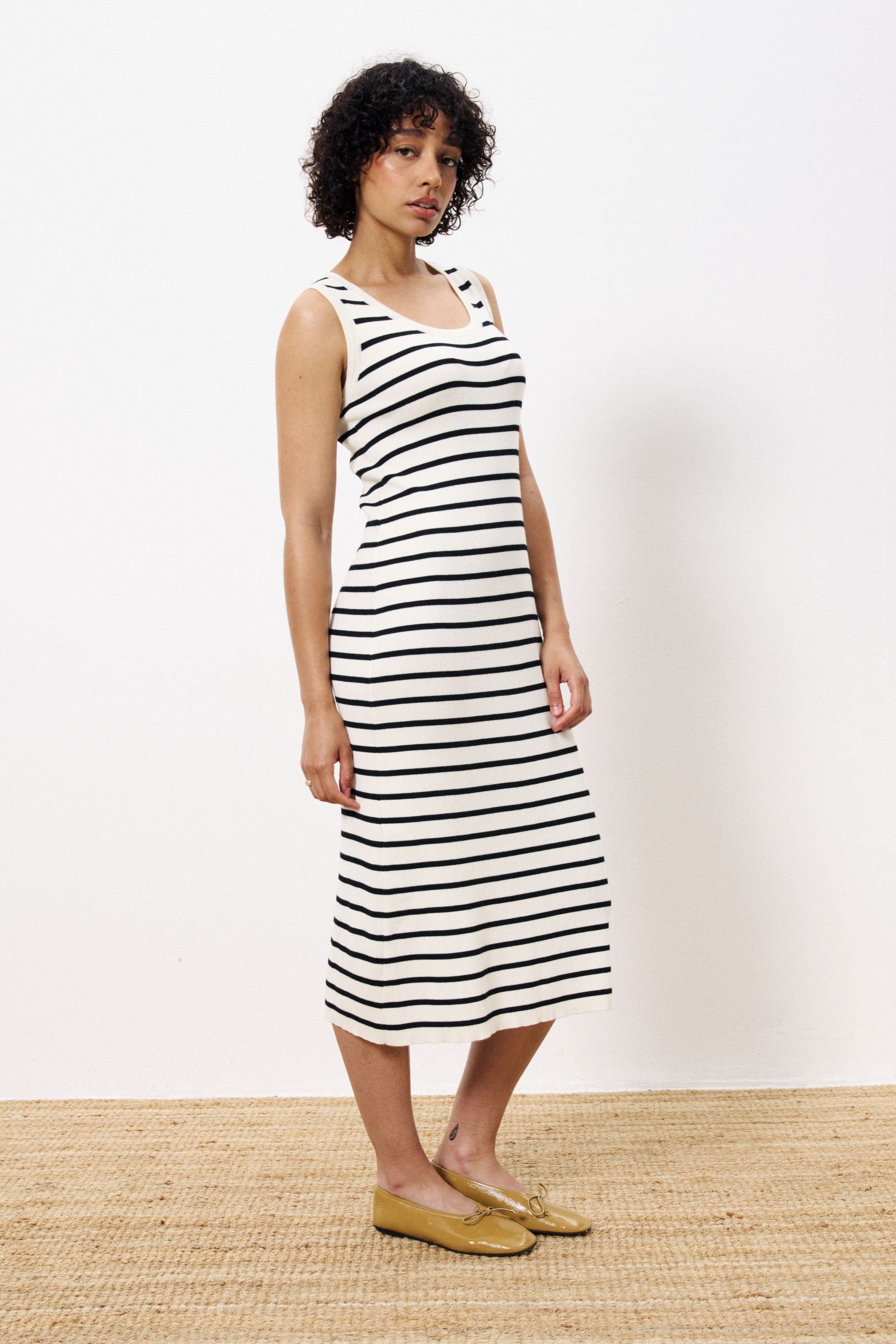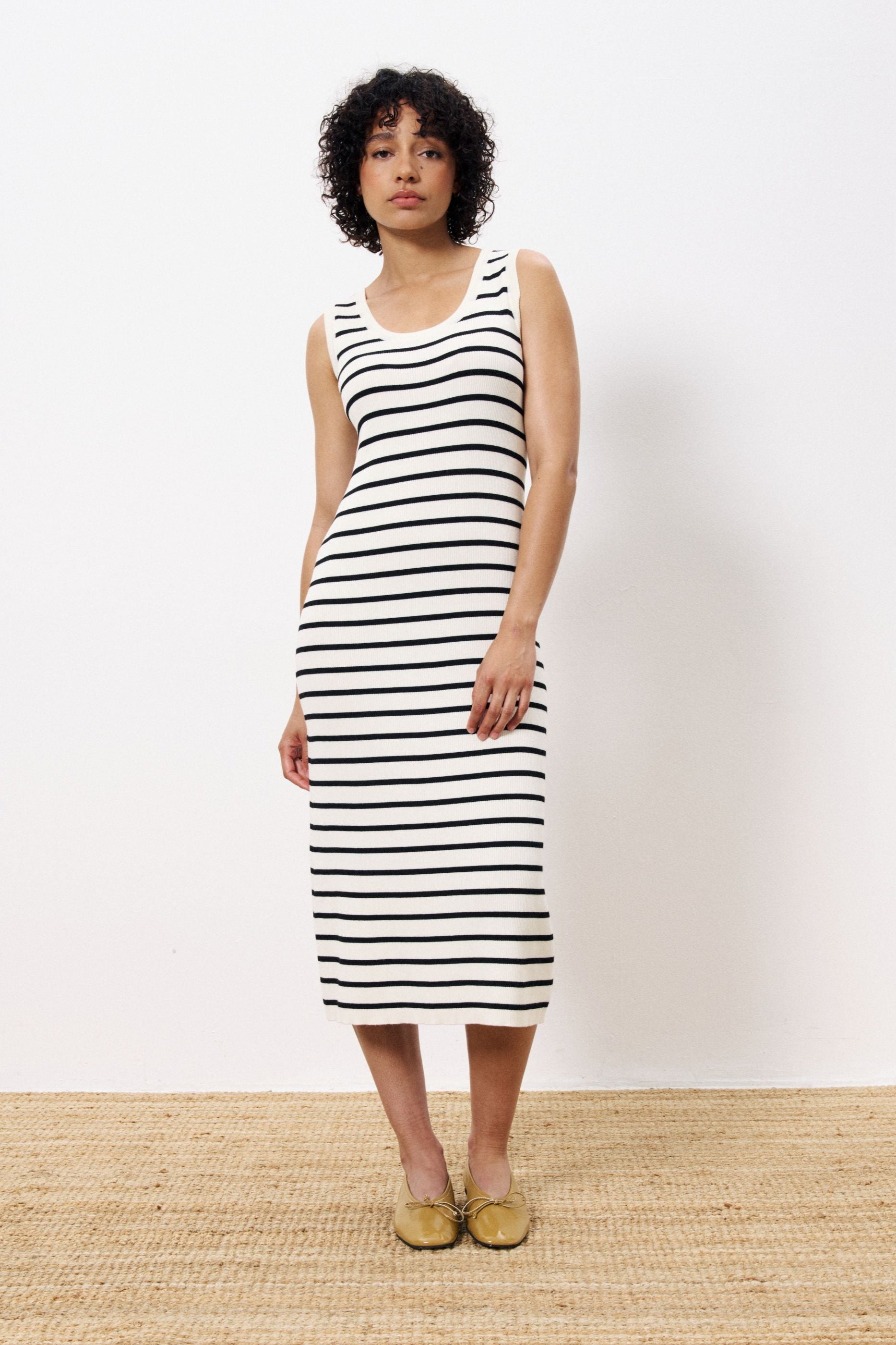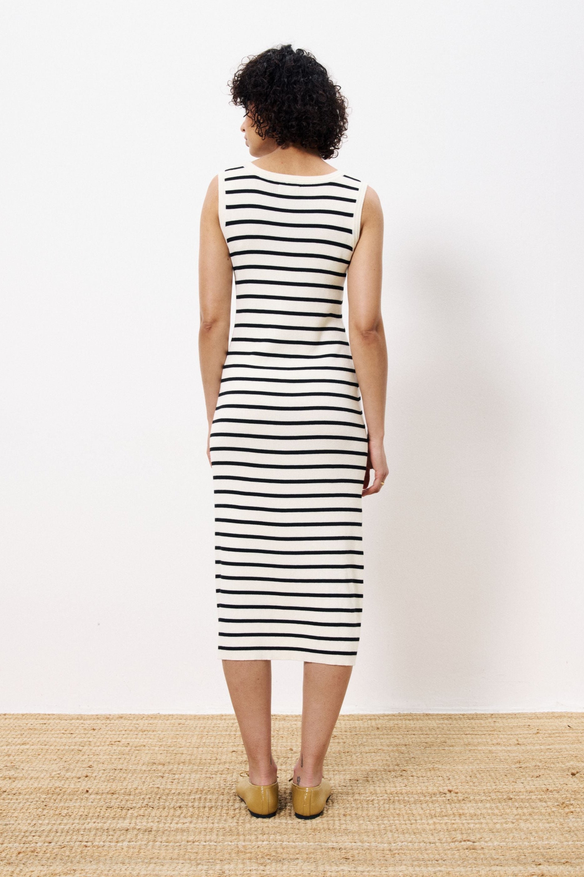Something about stripes adds polish to every outfit. This body-skimming dress is made with a wool blend. Sleek and sophisticated, this dress comes with bra friendly straps, a scoop neckline and a below-the-knee length.