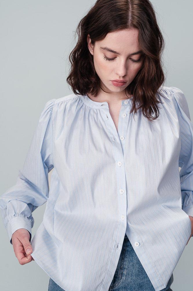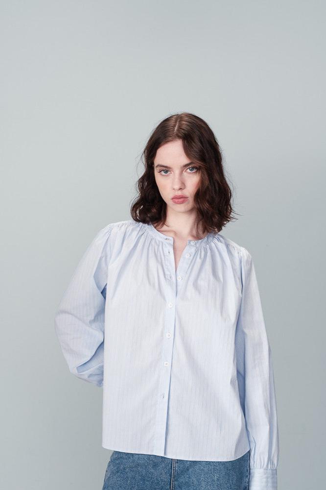 Primed for mixing and matching, this blouse is a future wardrobe stalwart in the making. It’s cut simply from a lightweight fabric to a floaty shape with blouson sleeves and a stand collar.