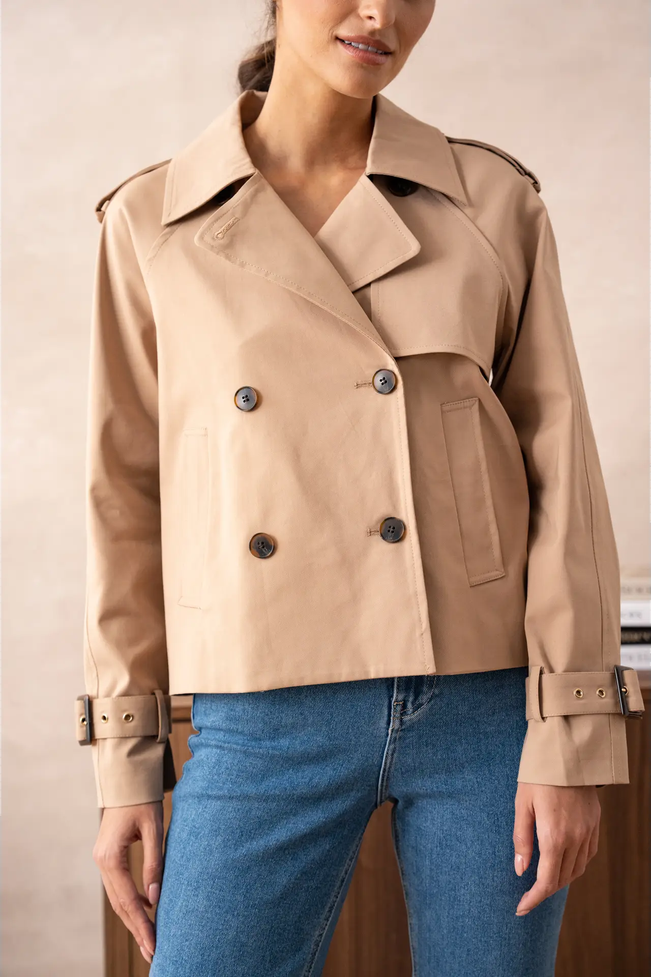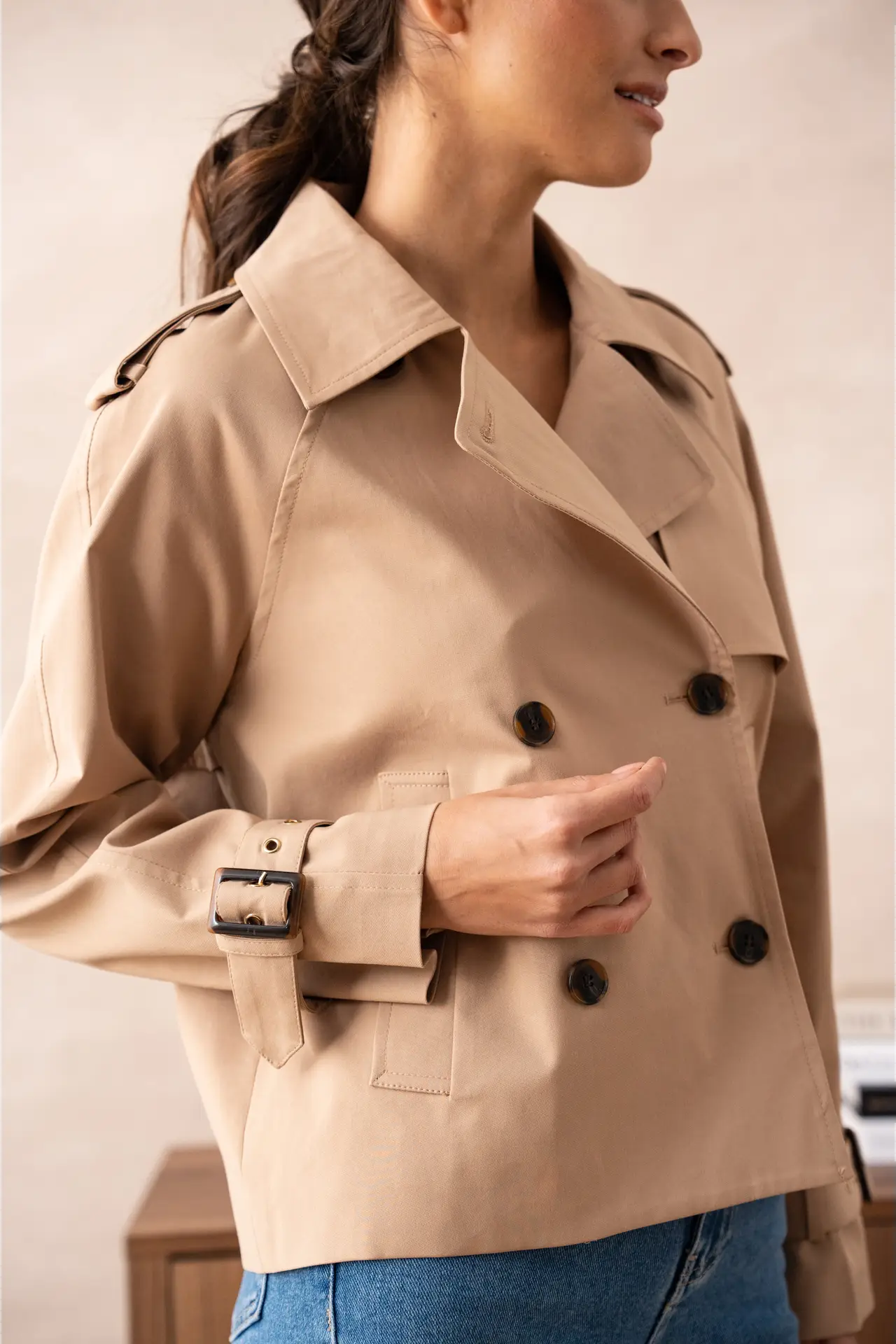 A lighter take on the ubiquitous trench coat, this cotton style is cropped to the hip and cut in a slightly oversized silhouette. Gold embellishments seal the deal.