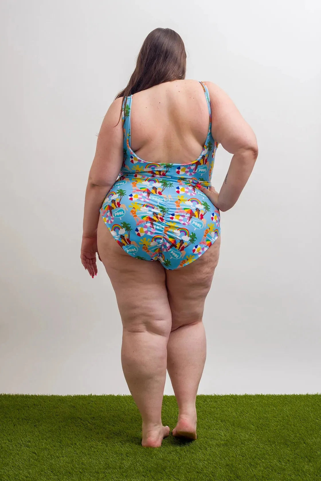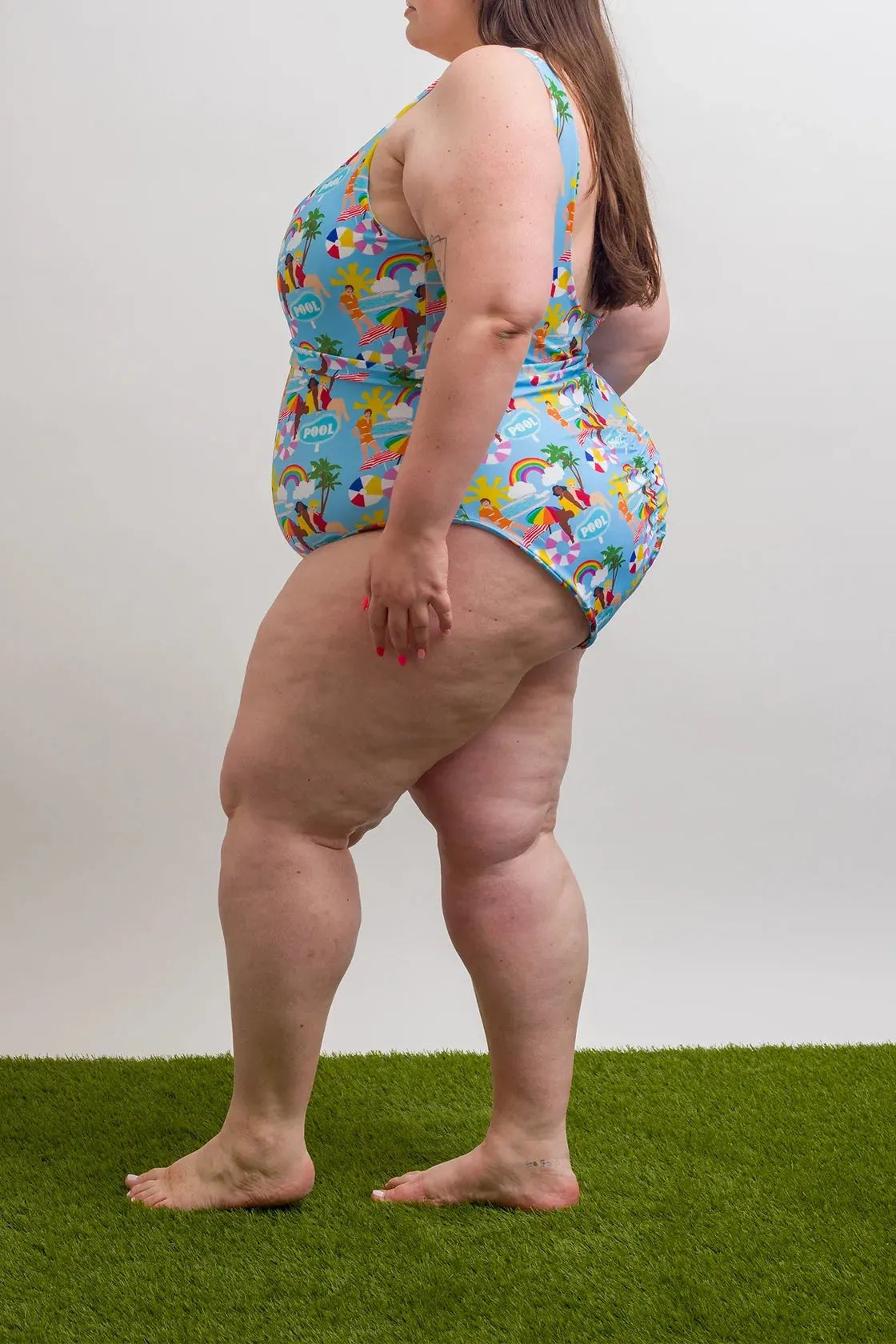 Dive into Hilary MacMillian’s first Swimwear collection with this flattering one piece featuring a vintage inspired custom Poolside print. This feminine silhouette features a semi-wide strap, high-cut front bikini style with a belt.