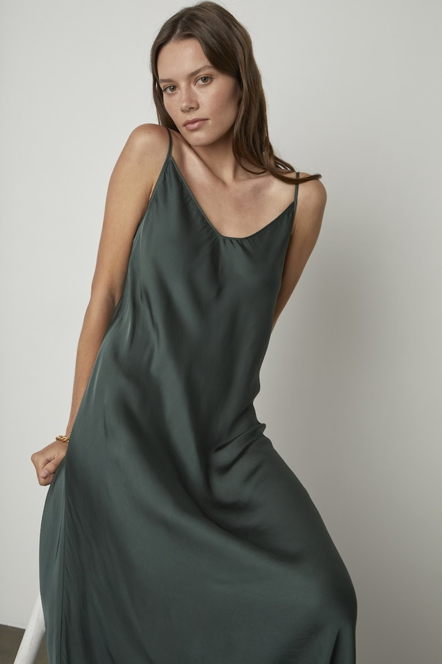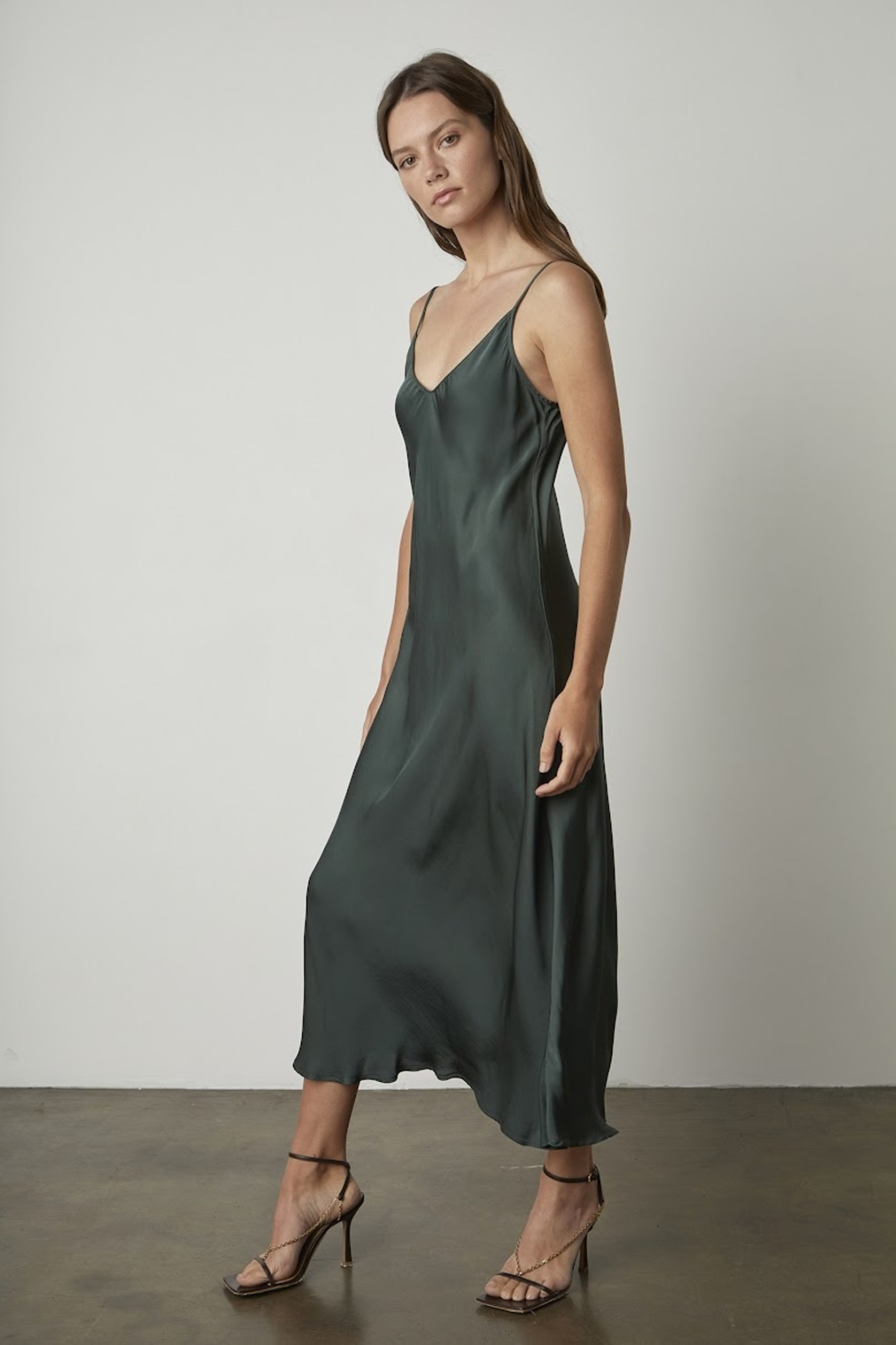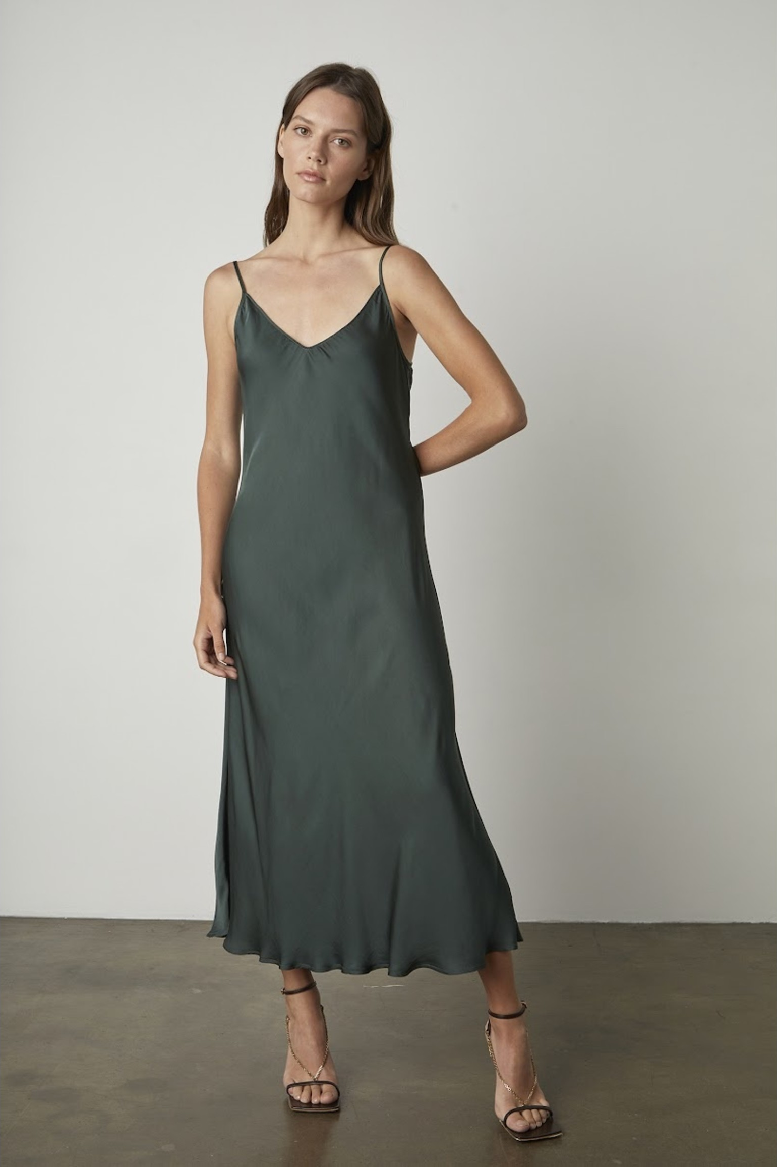 Our latest take on slip dressing. This '90s-inspired style features a subtle V-neck and flattering, longer length that can easily be dressed up or down. Plus, it's crafted from satin viscose-blend fabric, which is just as smooth as (and way more durable than) silk, machine washable and made super easy to style.