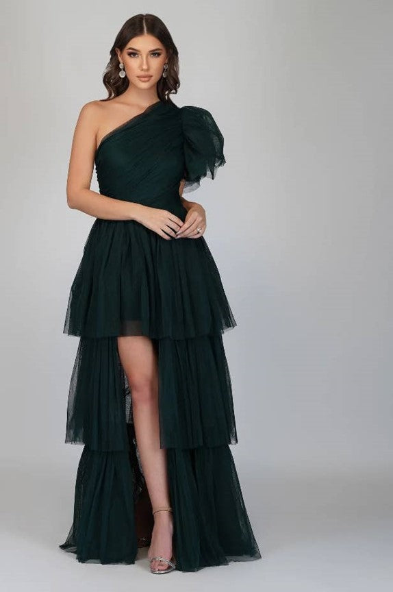 Ruched One-Shoulder Dress in Emerald Green Tulle