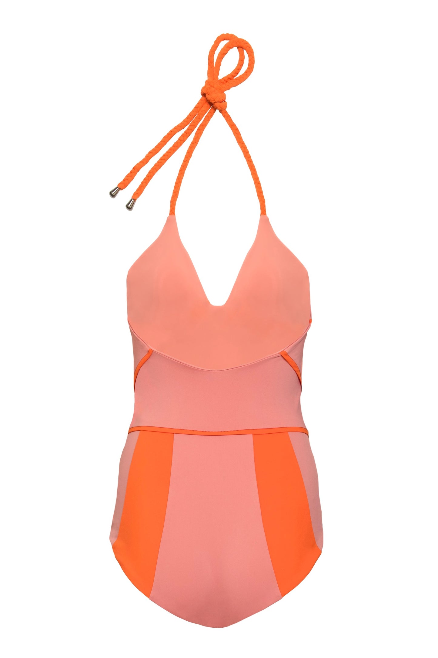 Meet Selena, a two-tone sunset hued halter swimsuit. With body contouring lines in all the right places, she's a full coverage suit with an open back, making for a muy caliente look.