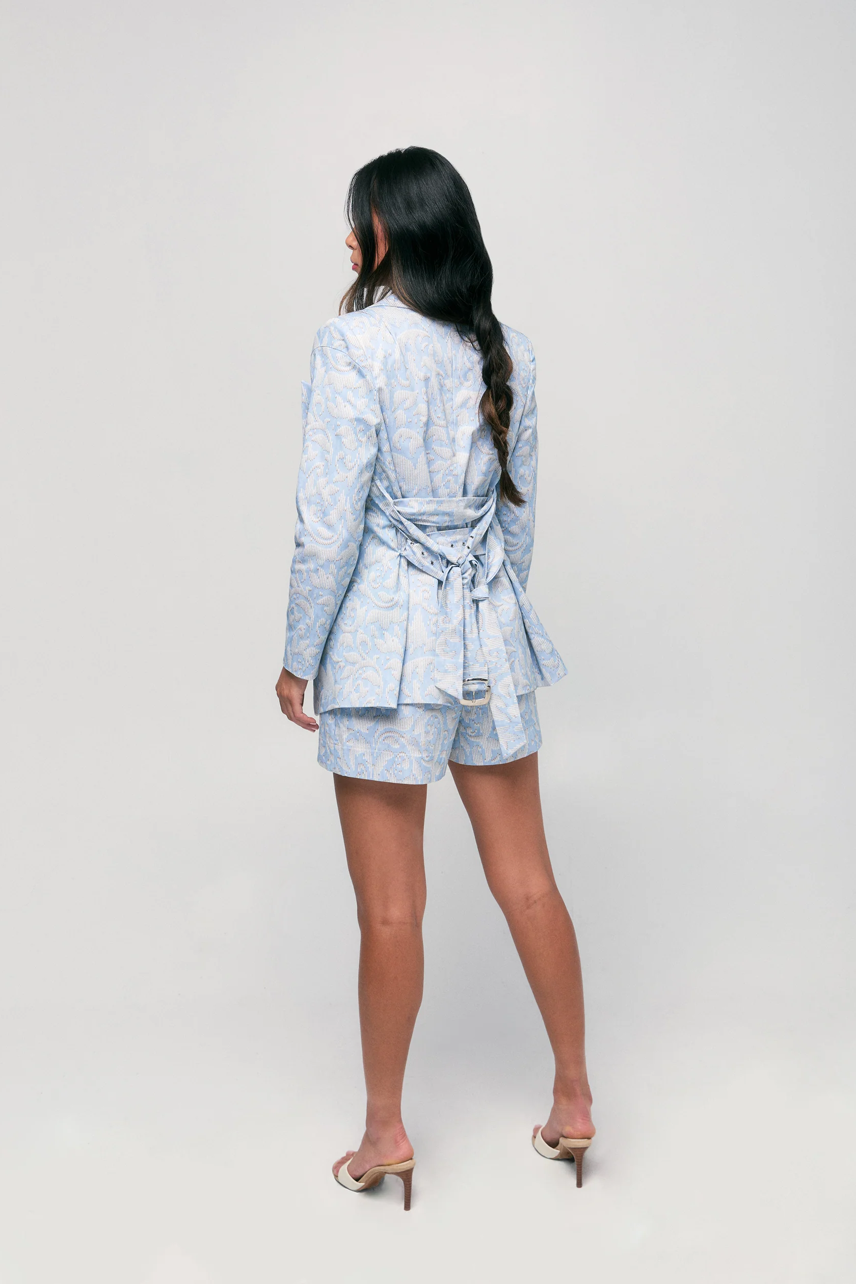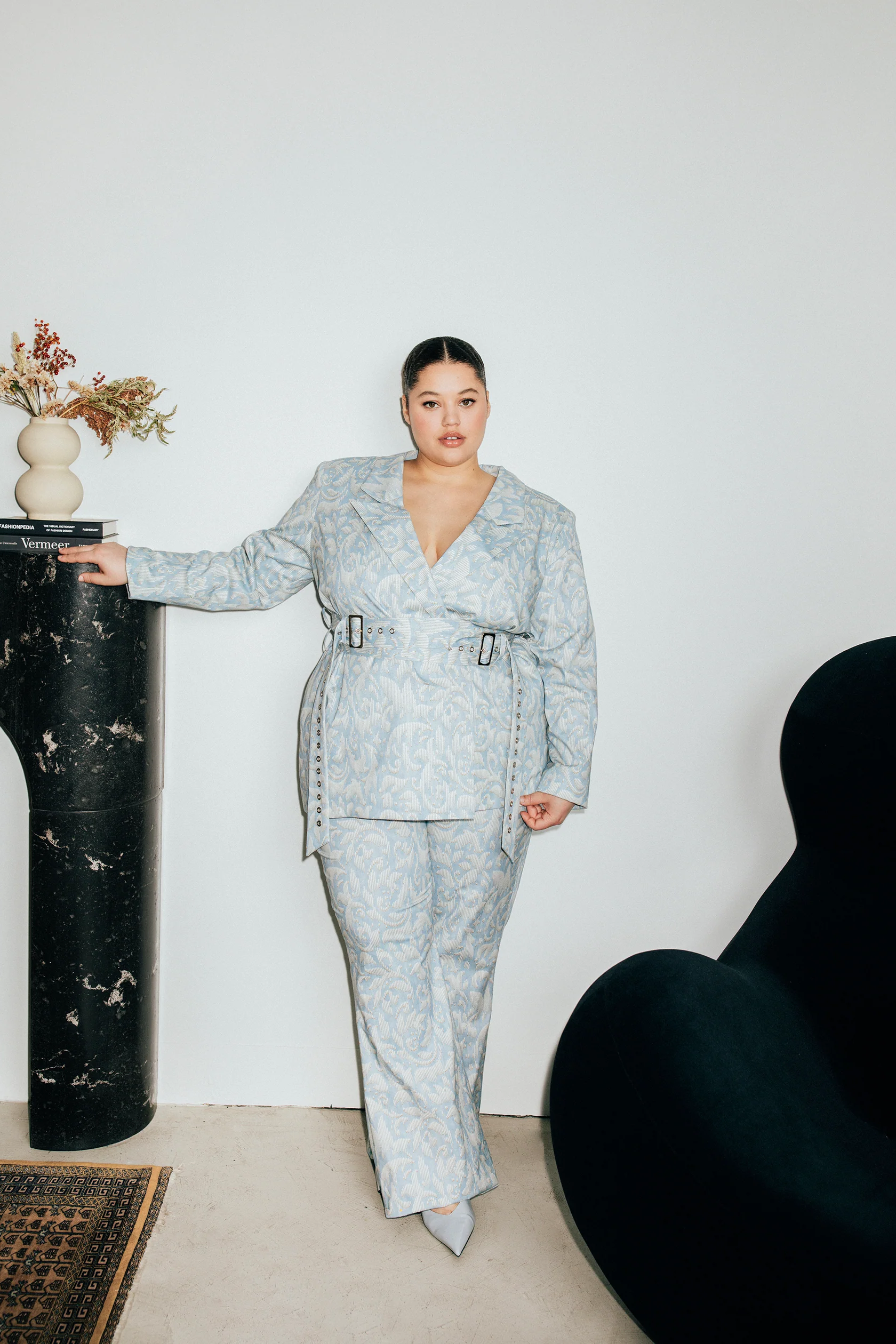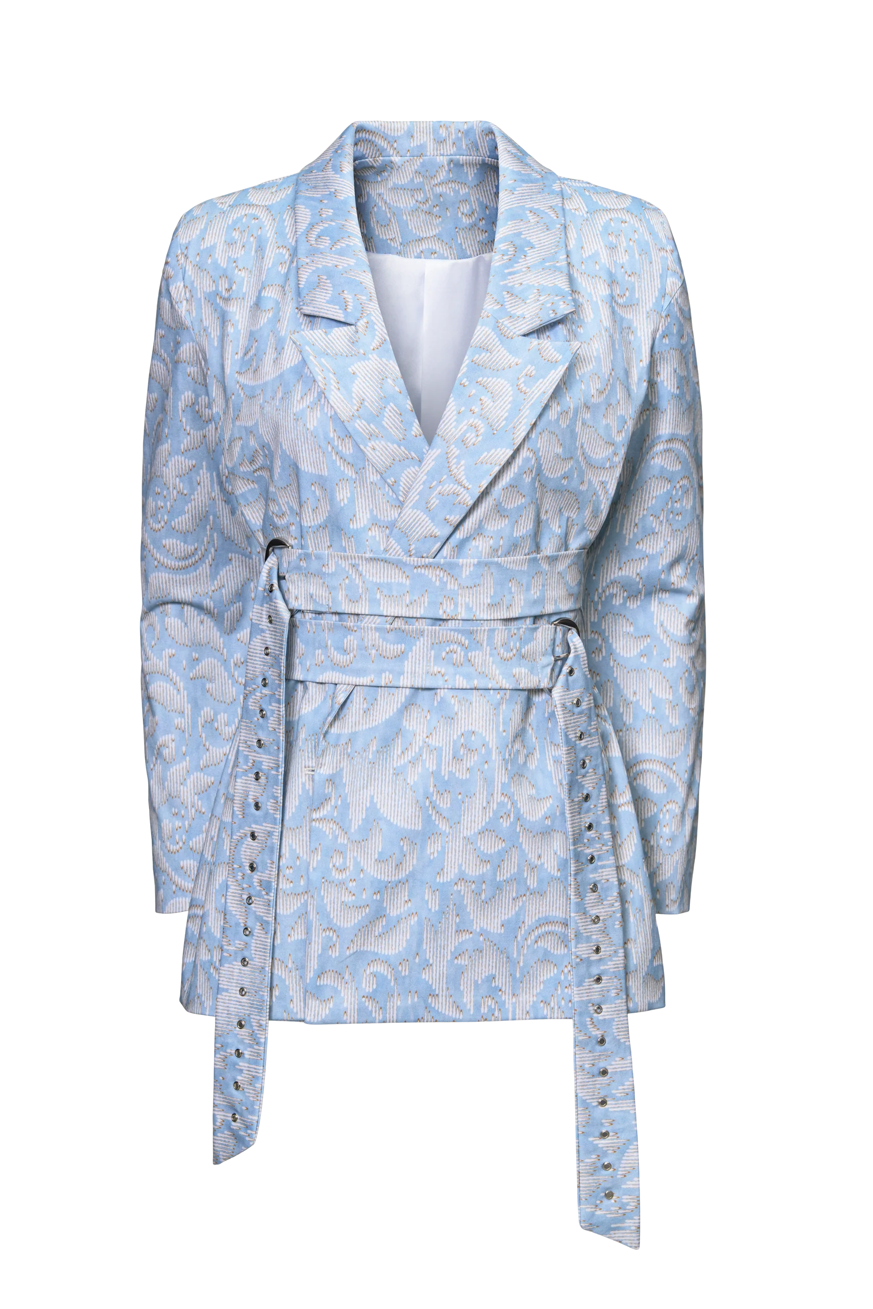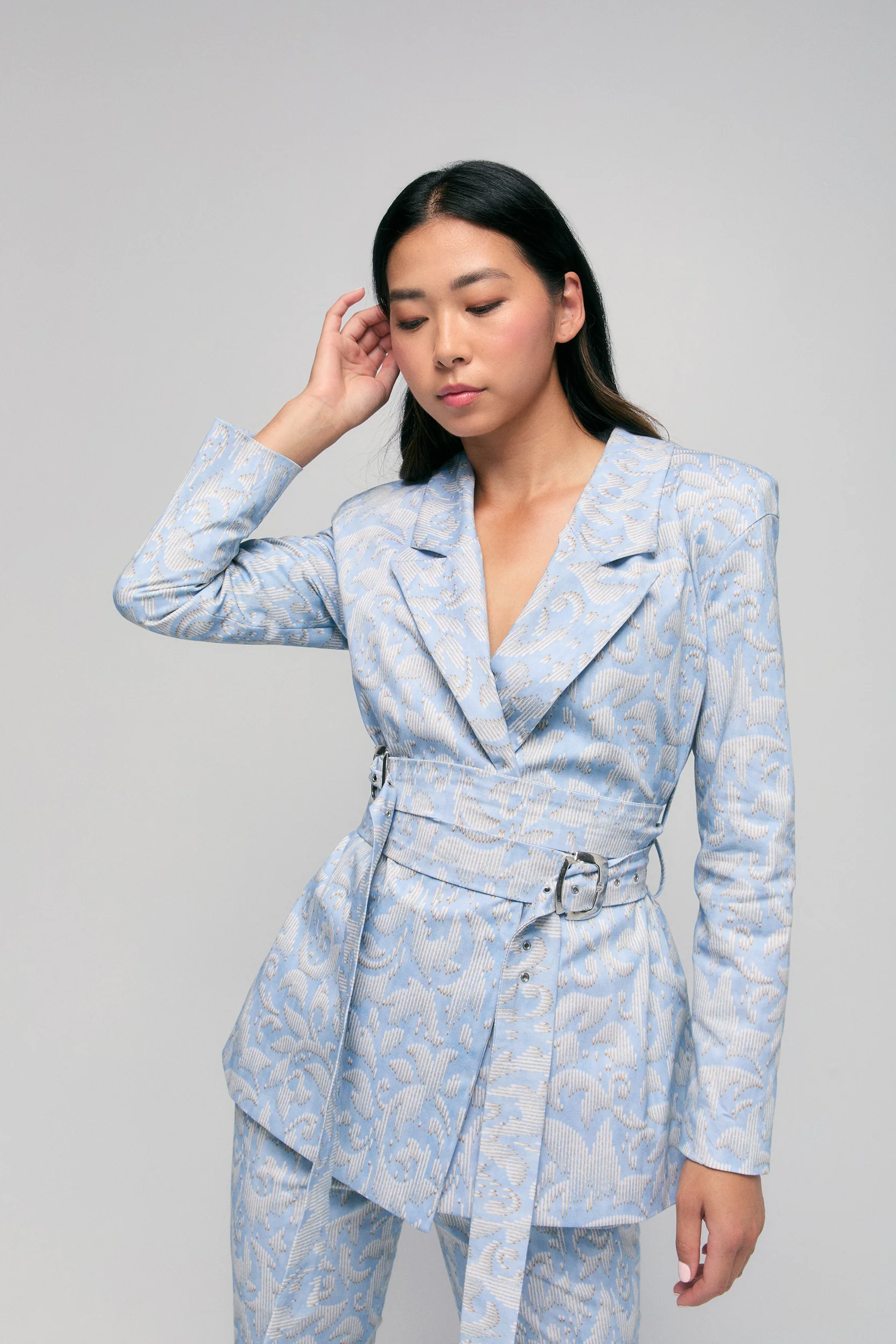 What size to order? This is a fitted blazer throughout the shoulders, and arms with a looser body to give you that cinched look at the waist achieved by the double belts. There are two inside hidden buttons to keep the blazer closed and keep its shape throughout the hips and hem. The fabric, and the lining have a slight stretch to it for comfort of wear, which also adds for movement across the back and arms. If you are between sizes, we recommend sizing down.